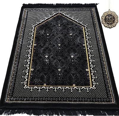 Modefa Turkish Islamic Velvet Prayer Rug - Thick & Wide Soft Carpet for Men & Women - Large Muslim Salah Mat - Ramadan & Eid Gift - with Car Hanger - Double Plush Topkapi Black